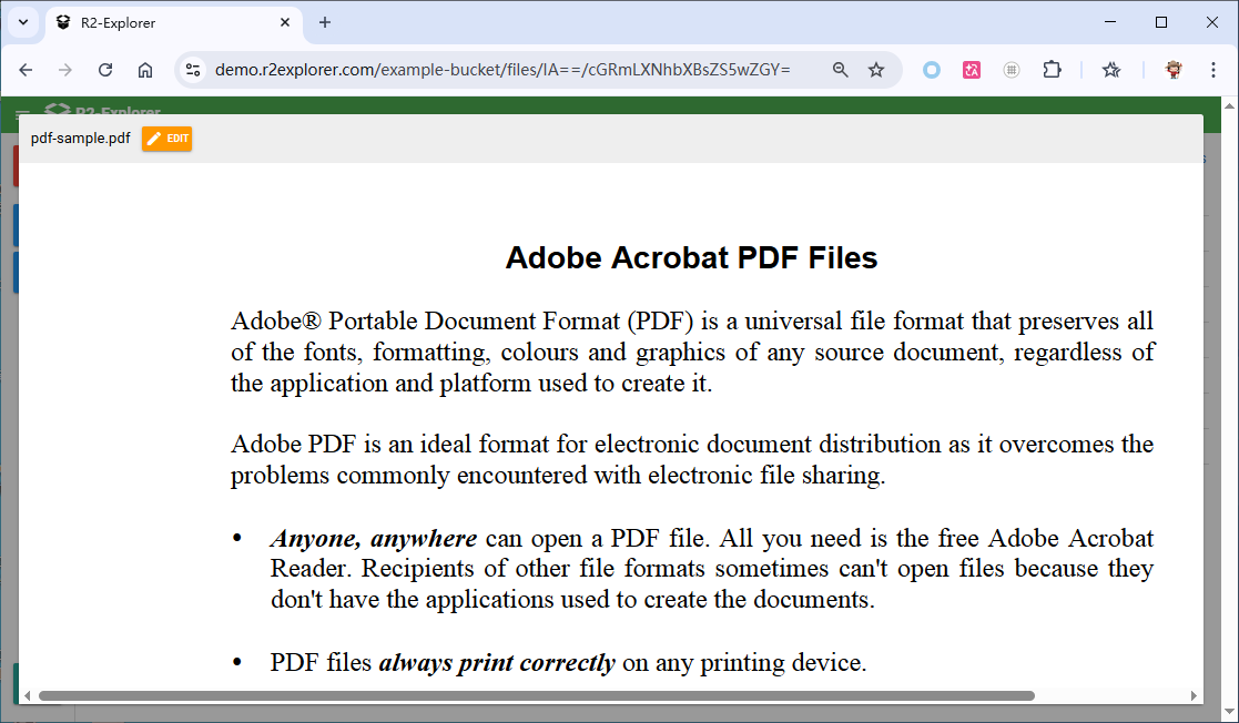 支持的文件管理包括: - 拖放式文件上传 - 文件夹的创建和组织 - 大文件分段上传 - 右键单击上下文菜单可查看高级选项 - HTTP/自定义元数据编辑 - 可共享链接 - 创建安全的公开文件 URL,可选择设置密码保护、过期时间和下载次数限制